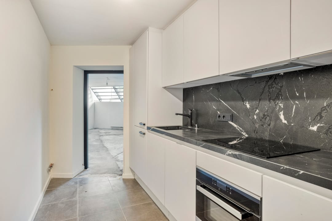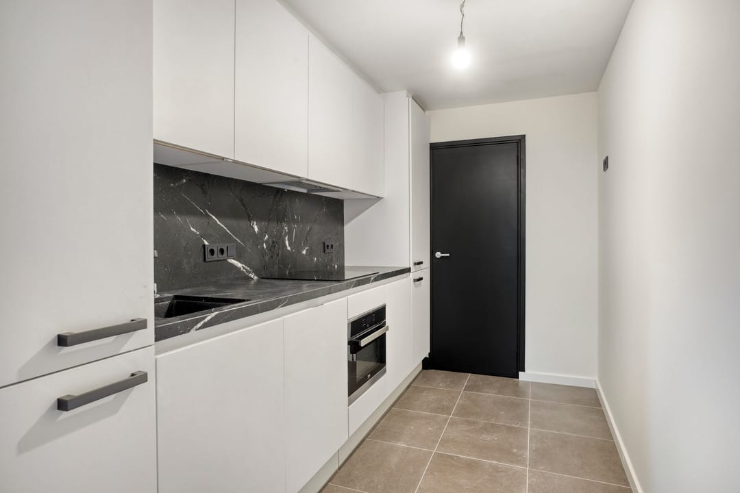 Doorloop naar de moderne pantry. De lichte pantry is voorzien van kastruimte, inductie kookplaat, oven, koelkast en een spoelbak. Het donkere blad in marmerlook maakt het geheel compleet.