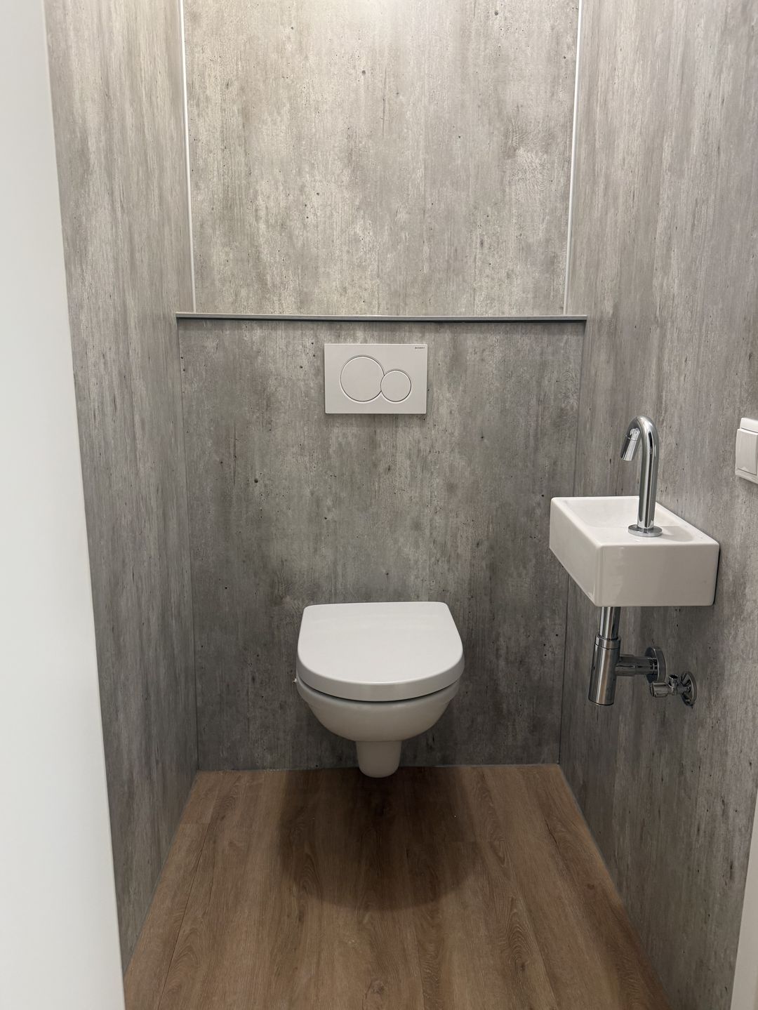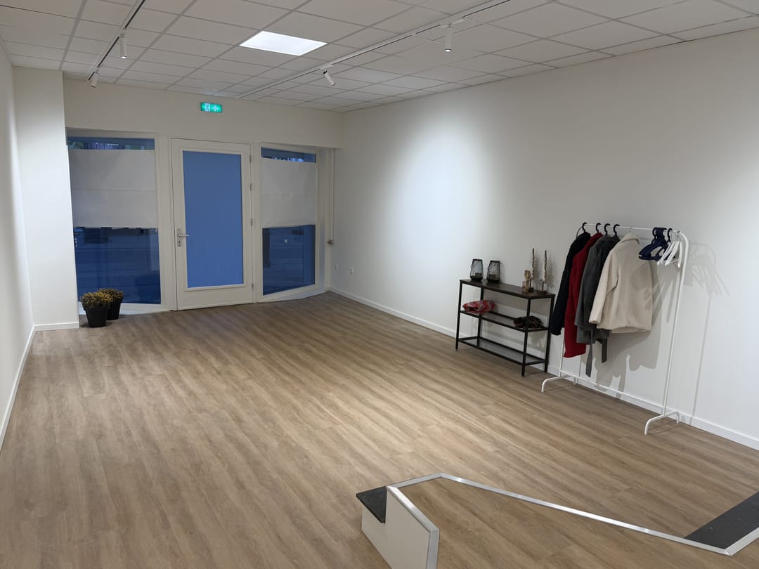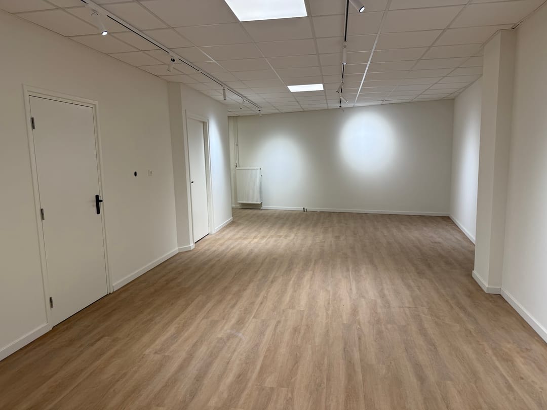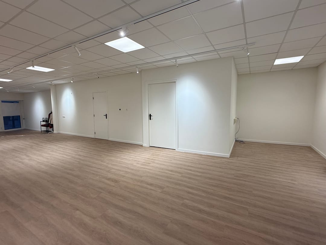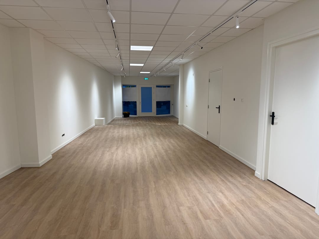 De ruimte is afgewerkt met strakke wanden, een nieuwe vloer, voorzien van een systeemplafond met verlichting en vernieuwde sanitaire voorzieningen en keuken.