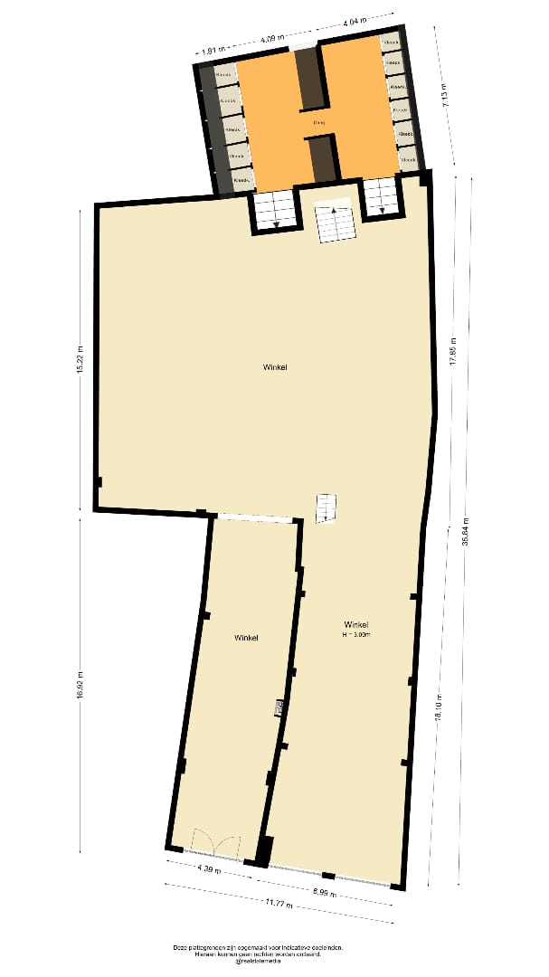 Verdeeld over meerdere bouwlagen, met een combinatie van winkelruimte en ondersteunende/facilitaire functies.