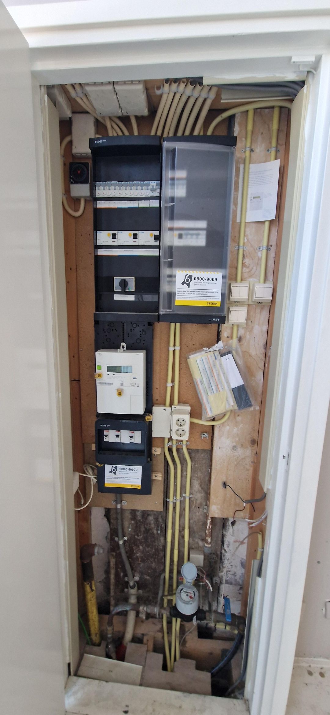 meterkast met 16 groepenautomaten van 16 Ampère, 4 krachtstroom groepenautomaten van 16