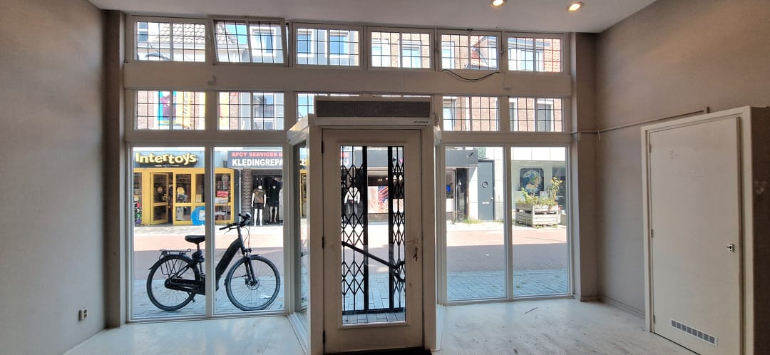 De winkelpui heeft een frontbreedte van ca. 5,9 meter en is v.v. houten kozijnen en dubbel glas en glas in lood als dubbele rij bovenlichten (deels te openen). De centraal geplaatste toegangsdeur is v.v. een harmonicahek als inbraakbeveiliging. De ruimte heeft veel daglichttoetreding via de raampartijen over de gehele breedte en hoogte van de voorgevel.