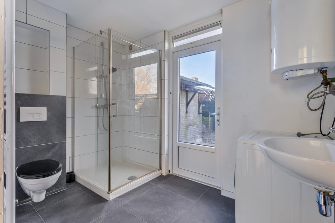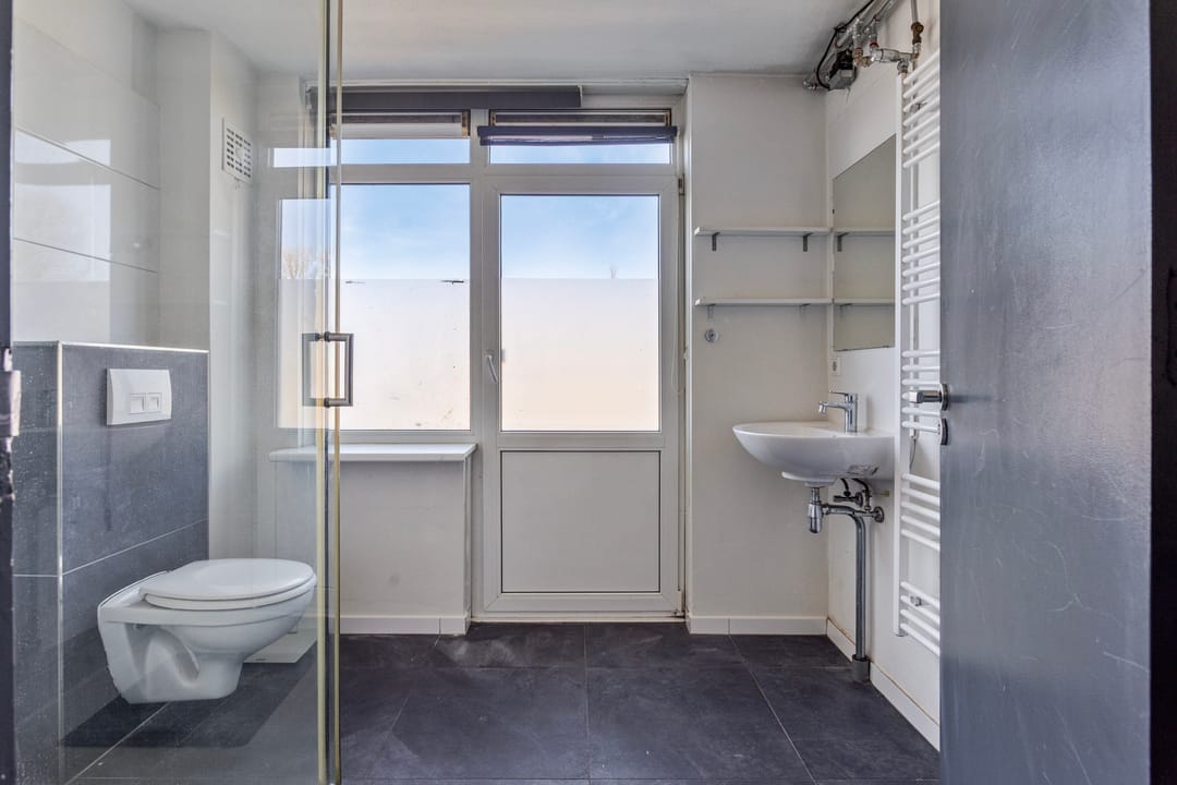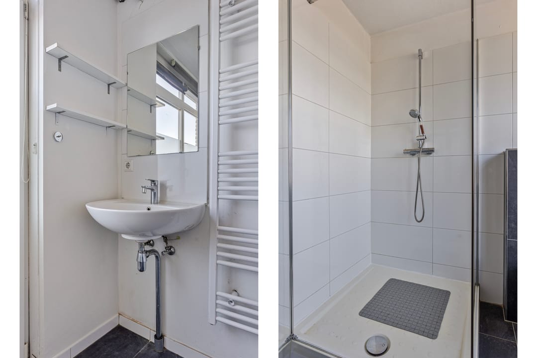 Nette badkamer met douche, wastafel, toilet en radiator.
