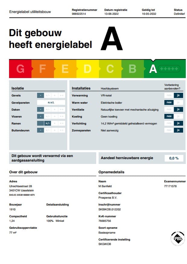 Het object is voorzien van energielabel A geldig tot en met 16 mei 2032.