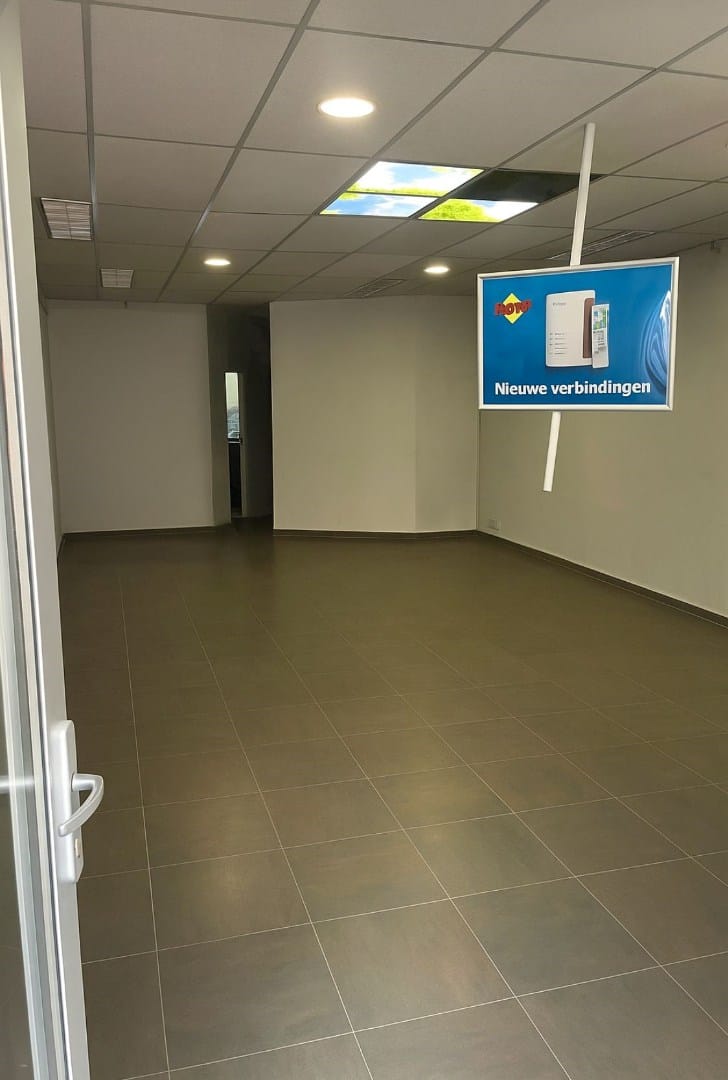 Winkelruimte van ca. 48m2 met systeemplafond, separate keuken met keukenblokje met spoelbak en bovenkastjes, toiletruimte met hangend closet en fontein, opslagruimte van ca. 13m2.