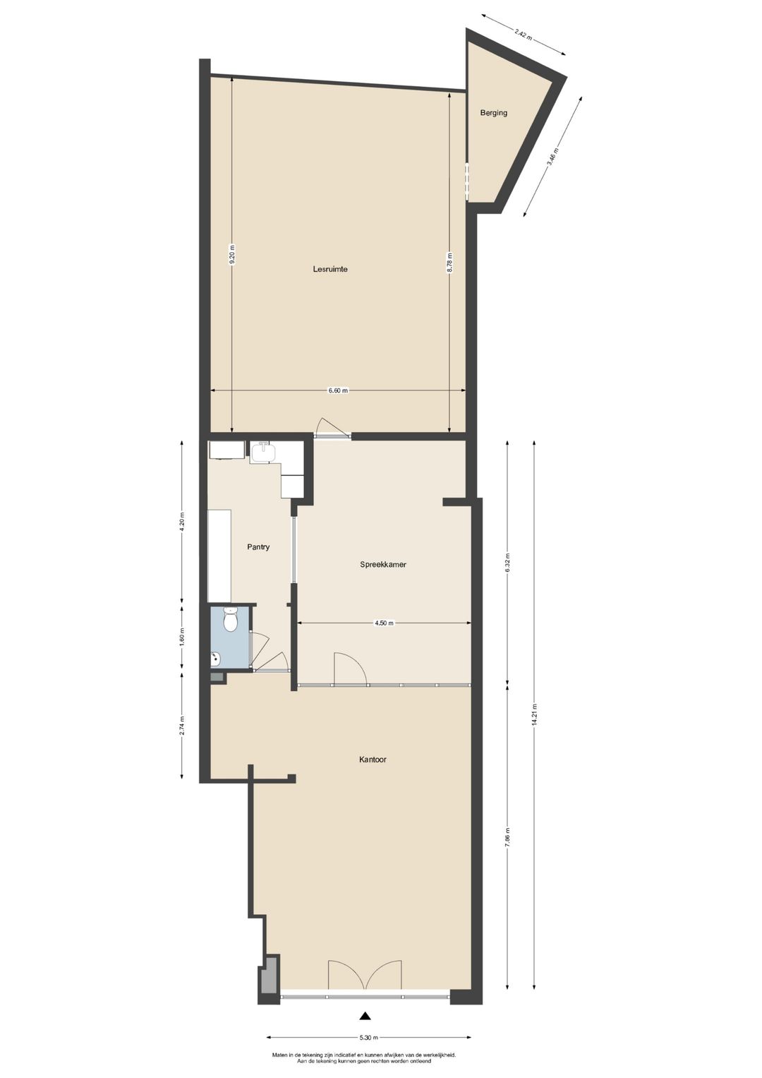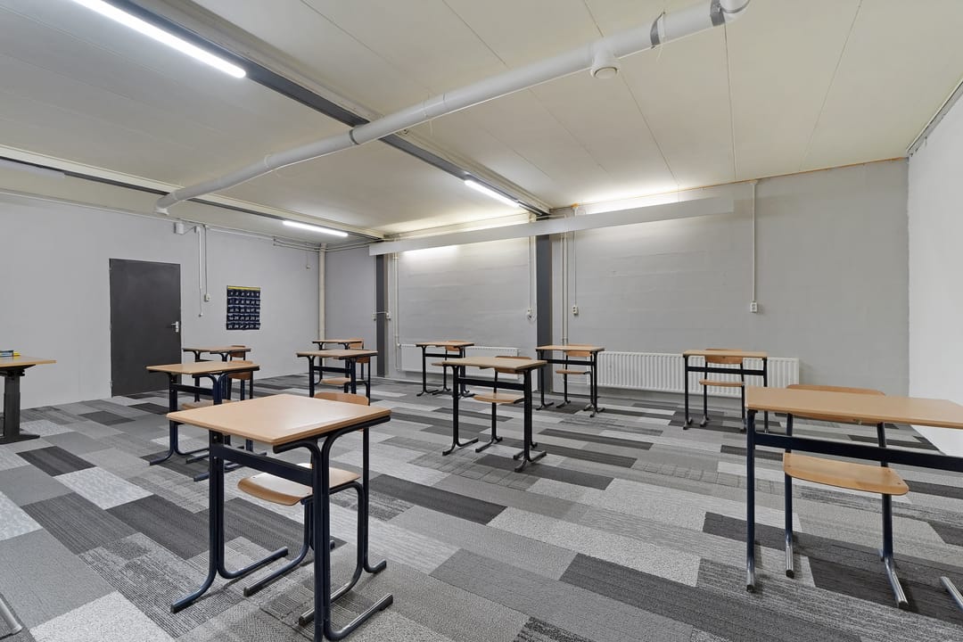 Bij binnenkomst treft u een ruimte ontvangstruimte met toegang tot de pantry en het toilet. Gescheiden door een glazen wand is er achter de ontvangstruimte een grote werk cq kantoorruimte ontstaan. Weer daarachter het leslokaal wat uiteraard ook voor andere doeleinden gebruikt kan worden o.a. bijeenkomsten, vergaderingen of vergroting van de werkruimte cq verkoopruimte. Tevens treft u nog een bergruimte aan.