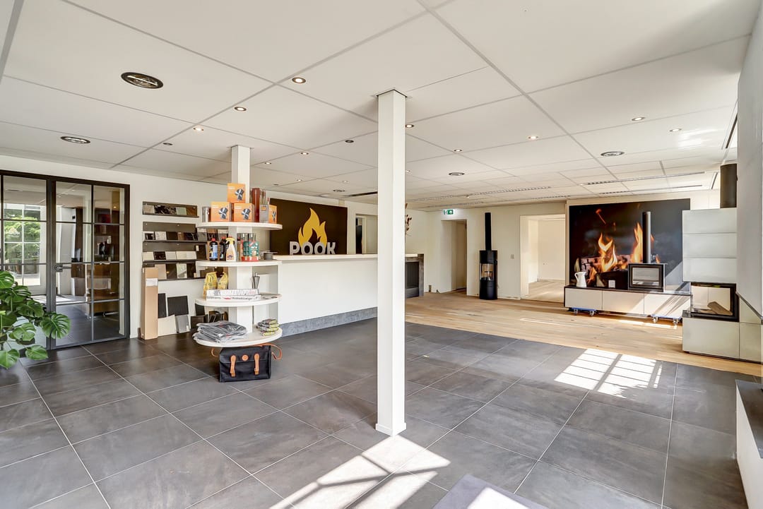 - Riante showroom-/kantoorruimte + magazijn van circa 909 m² + ca. 293 m² aan (boven) bedrijfswoning met ruim dakterras van ca. 76 m²
