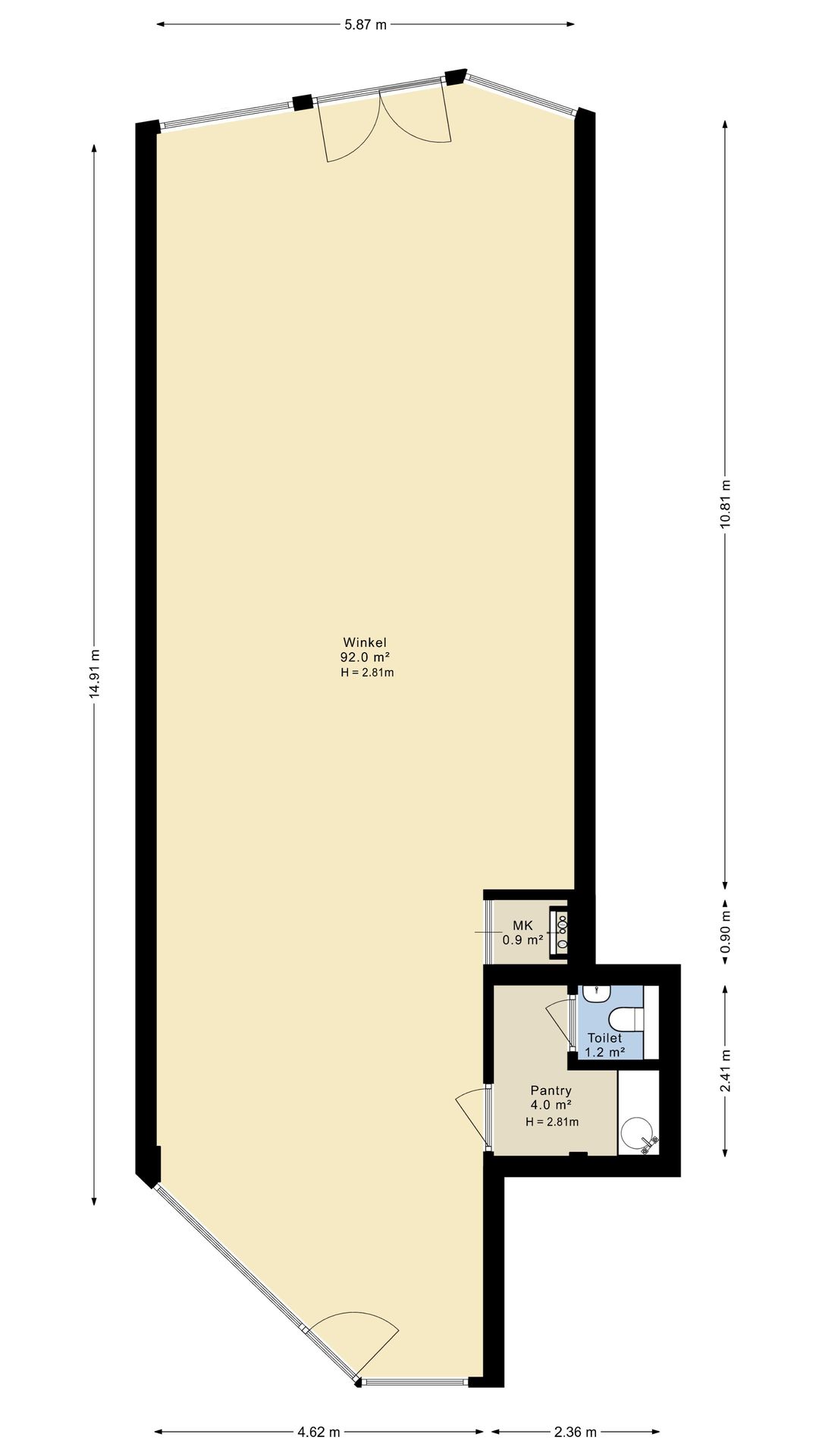 De totale verhuurbare vloeroppervlakte bedraagt circa 98 m² winkel- en overige ruimten op de begane grond.