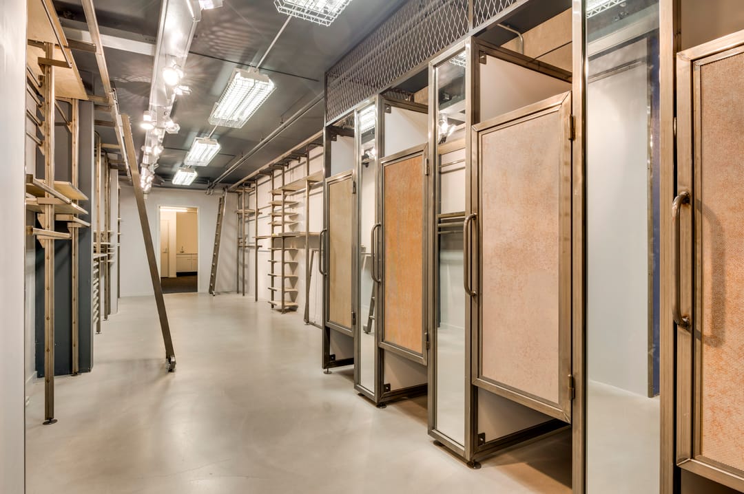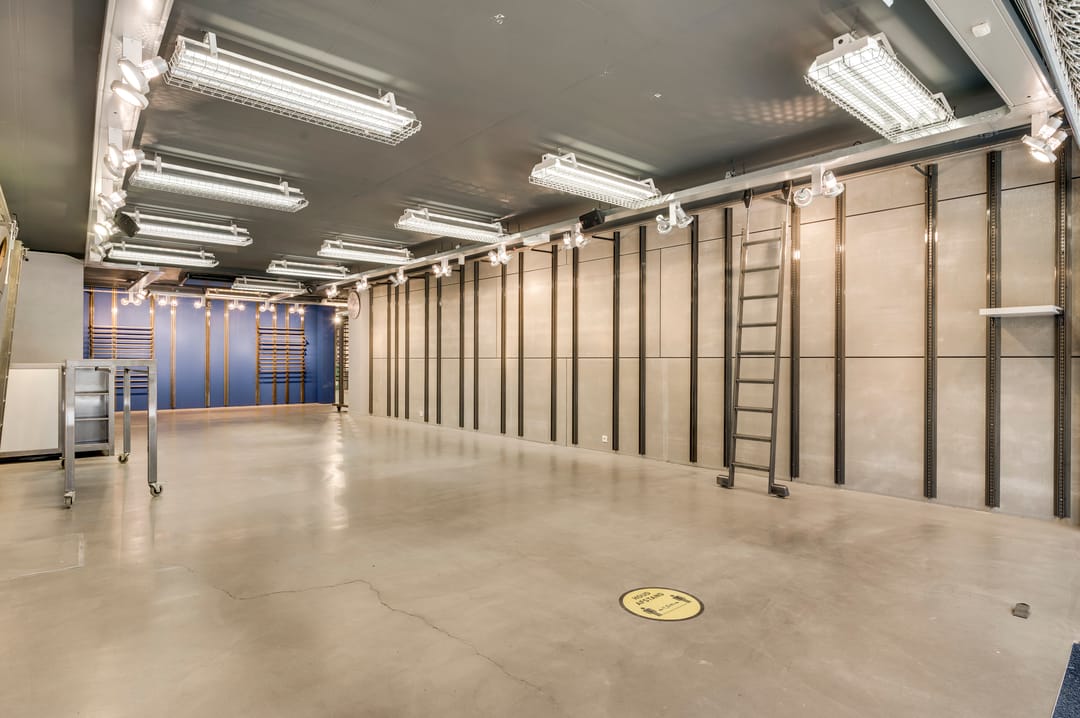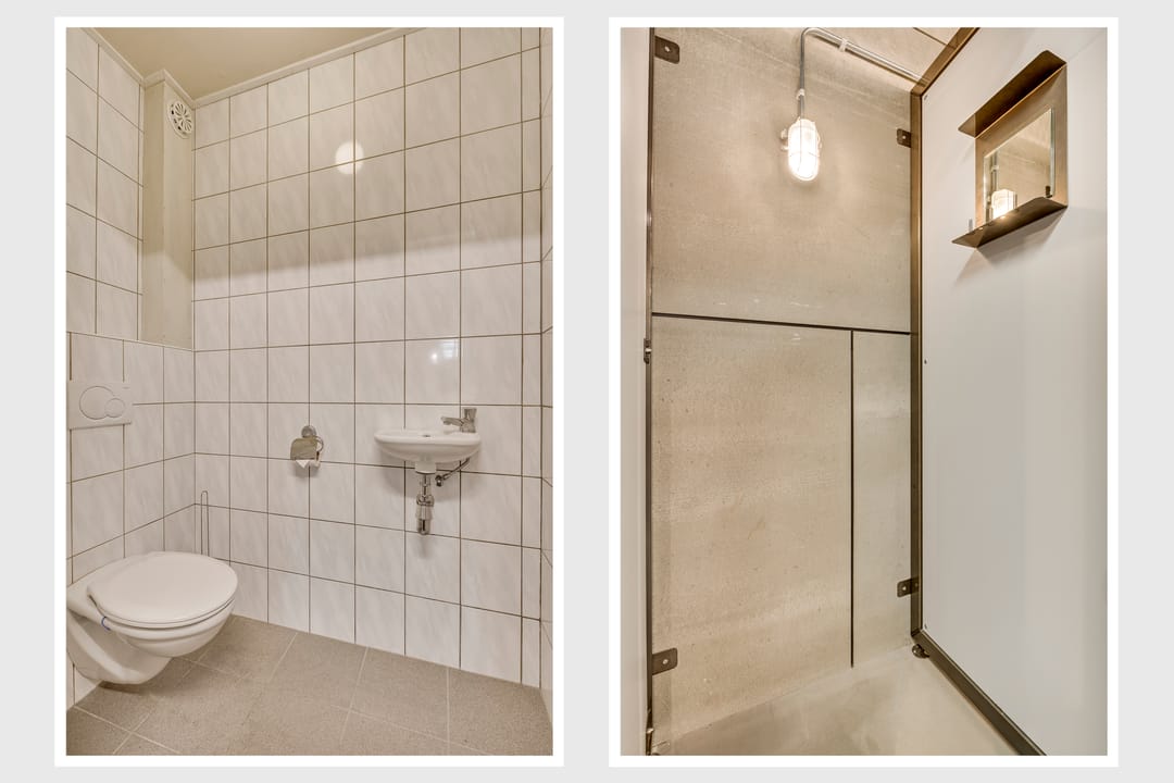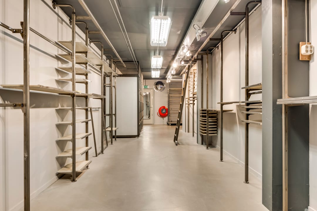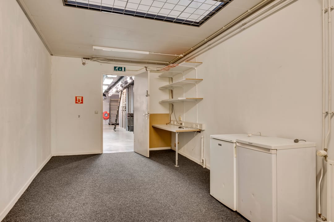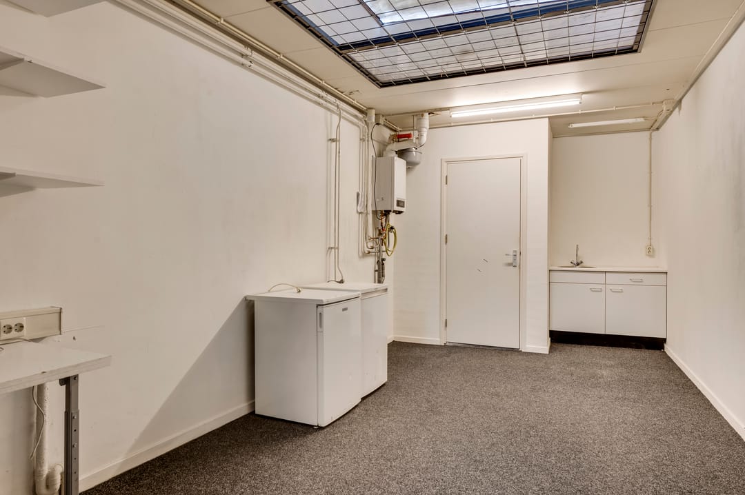 Aan de achterzijde bevindt zich het magazijn van circa 21 m², waarin tevens de pantry, de cv-opstelling en een geheel betegelde toiletruimte met hangcloset en fonteintje zijn gesitueerd. Daarnaast is hier een keukenblok, radiator en een lichtkoepel aanwezig, waarbij voldoende ruimte overblijft voor praktische opslag.