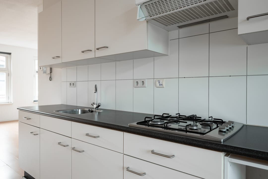 De keuken is uitgerust met een gasfornuis, afzuigkap en spoelbak en biedt directe toegang tot het terras. Vanuit de keuken kom je in de ruime en lichte woonkamer, die voldoende ruimte biedt voor zowel een eethoek als een comfortabele zithoek