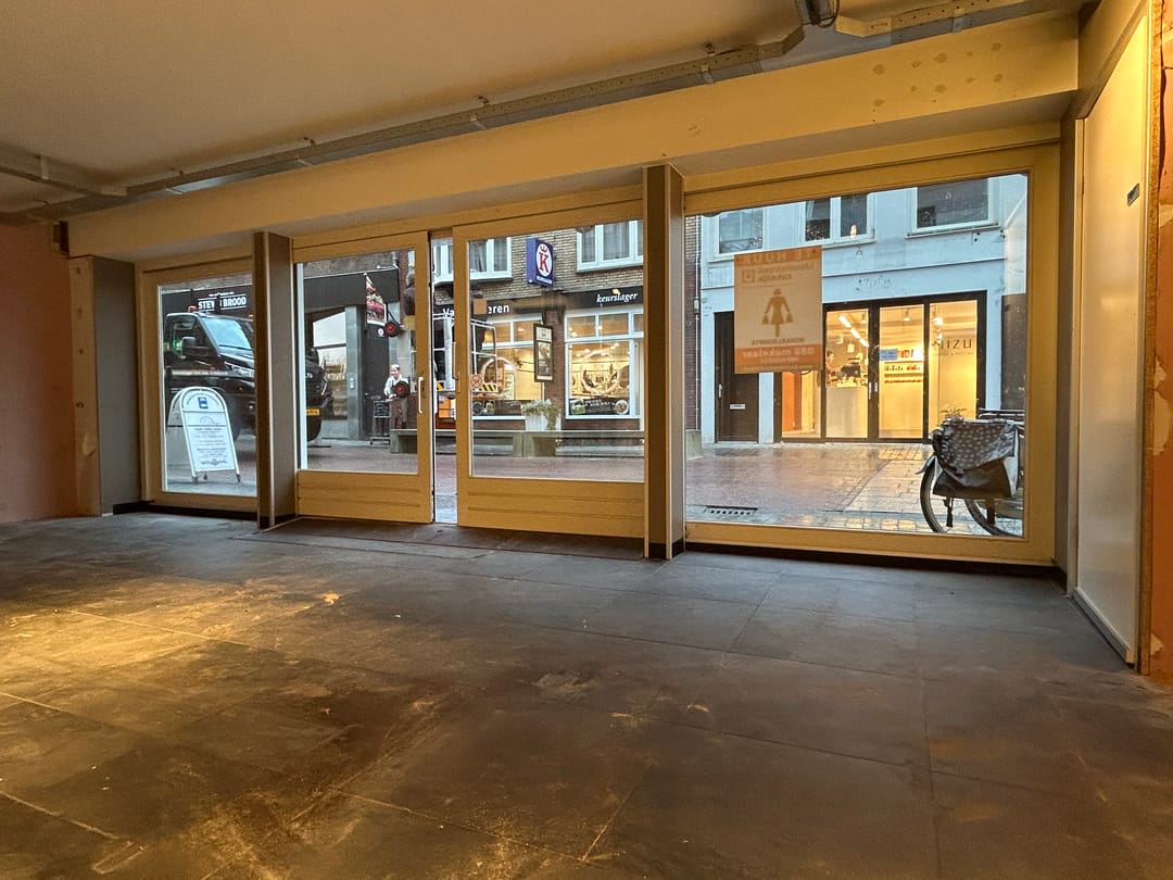 De winkel ligt in de Kruisstraat en is zowel via de Rijnstraat als de Voorstraat te bereiken. De entree heeft een frontbreedte van circa 7,7 meter. De grote raampartijen zorgen voor veel daglichttoetreding. De plafondhoogte is 2,5 meter. Middels een schuifdeur is de achterzijde van de winkel te bereiken, waar zich ook een toiletruimte bevindt.
