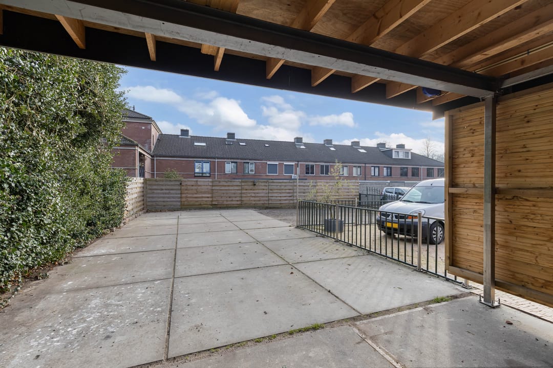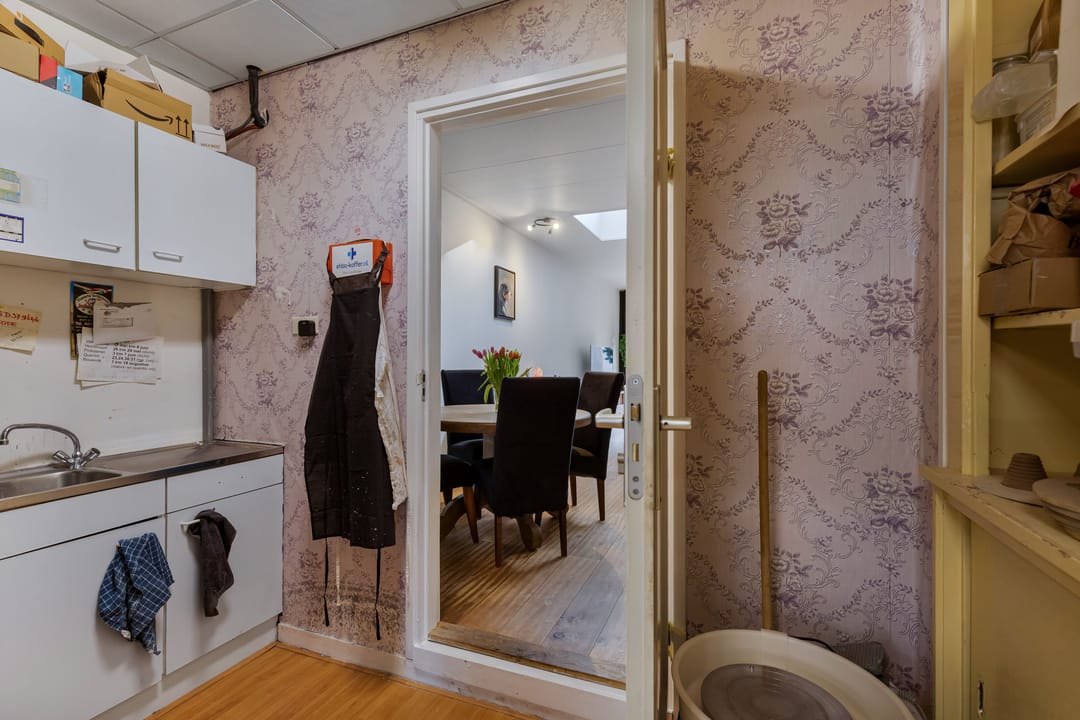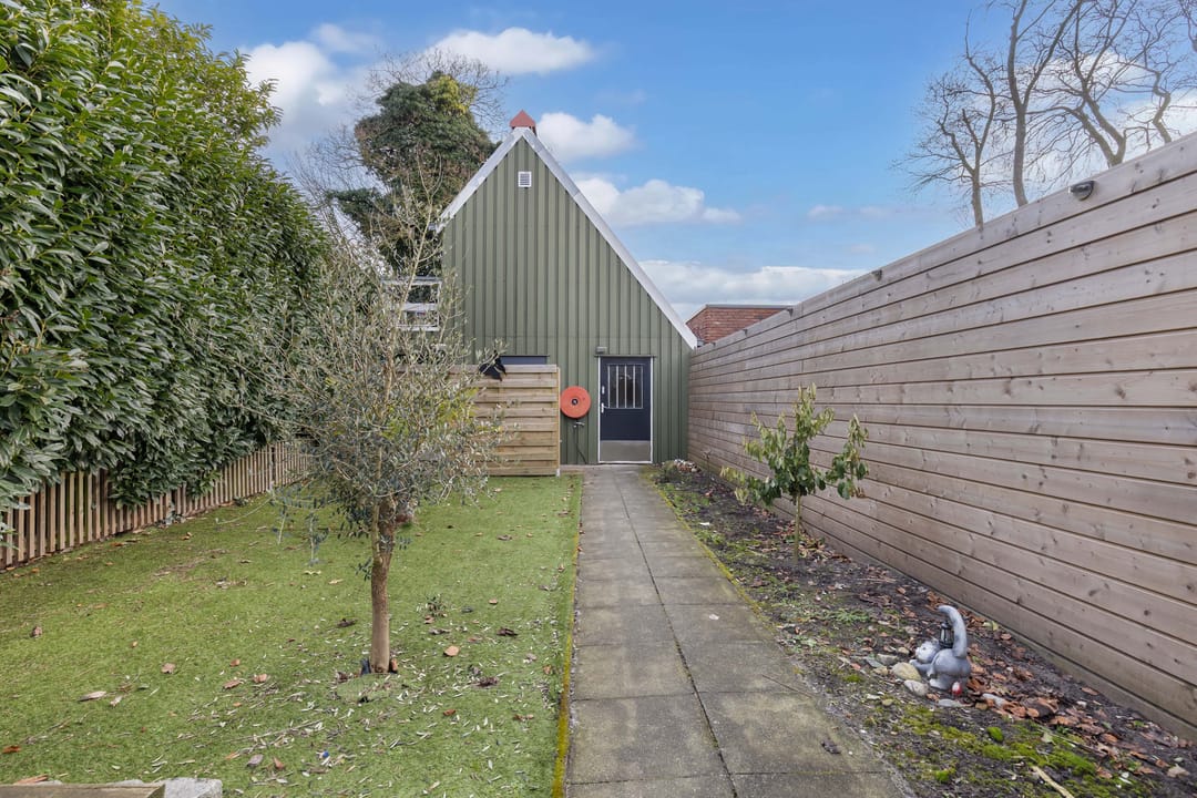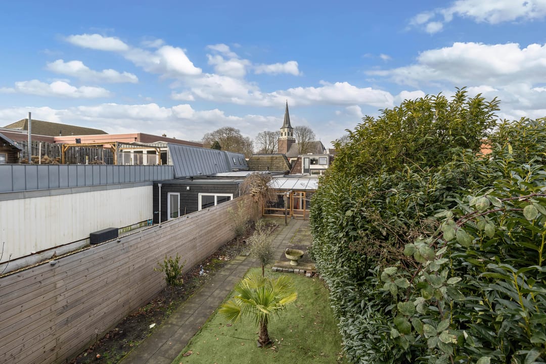 Achter het pand ligt een diepe, zonnige achtertuin met achterom, een zeldzaamheid in het centrum. De tuin biedt volop privacy en ruimte om te ontspannen, maar ook parkeermogelijkheden op eigen terrein, wat het geheel extra praktisch maakt. Dankzij de diepte en ligging is er op elk moment van de dag een fijne plek in de zon of schaduw te vinden.