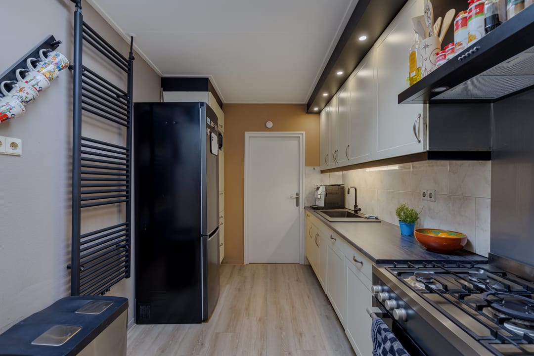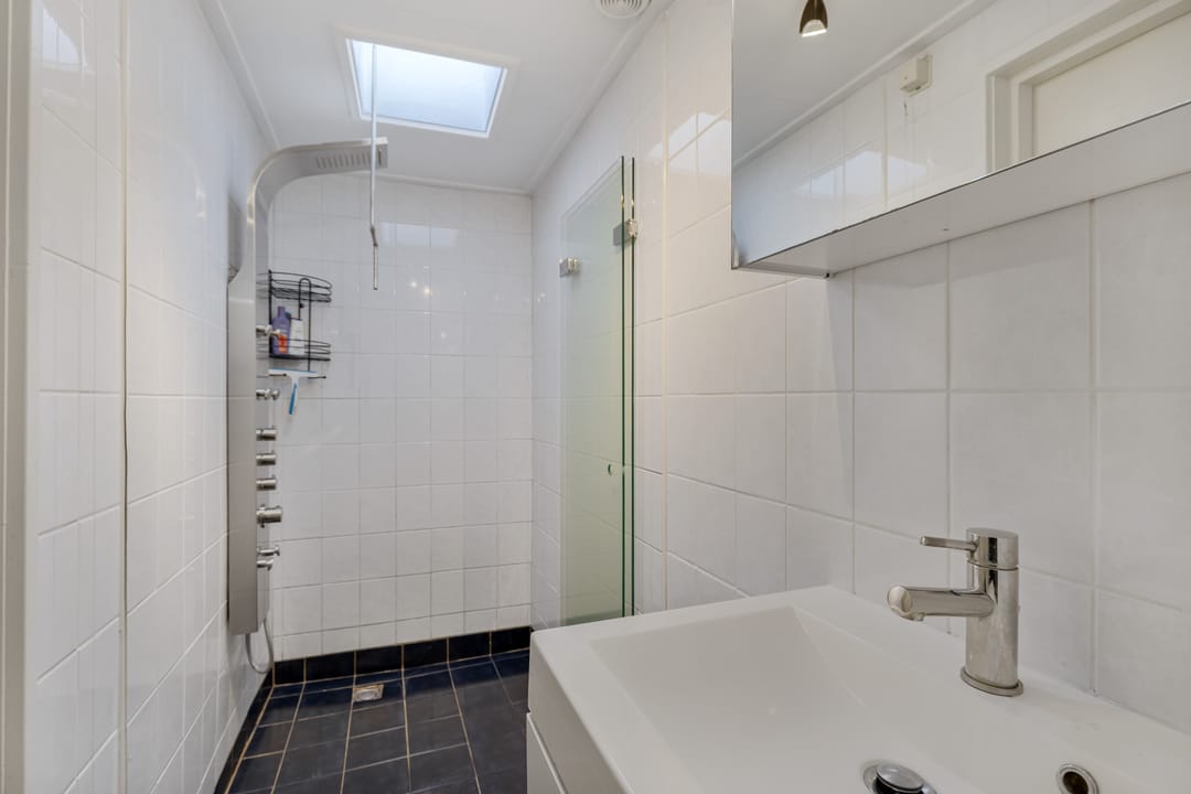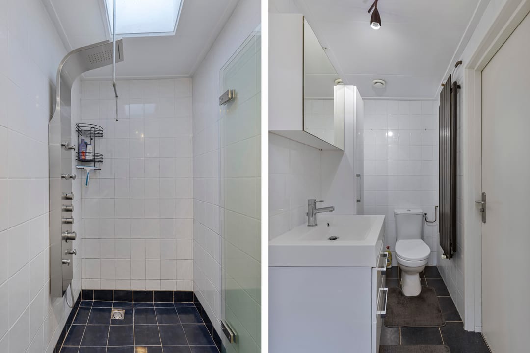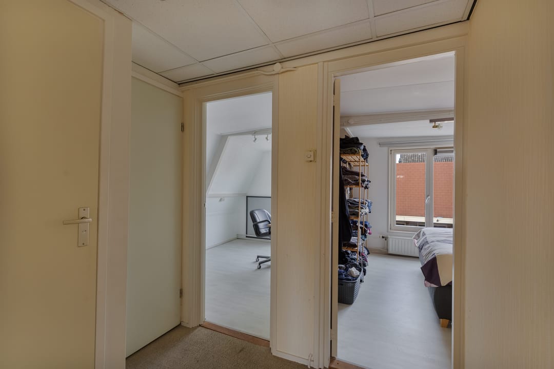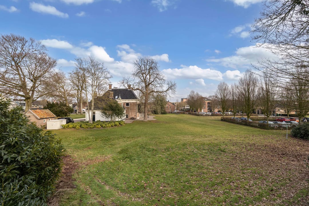Achter het pand ligt een diepe, zonnige achtertuin met achterom, een zeldzaamheid in het centrum. De tuin biedt volop privacy en ruimte om te ontspannen, maar ook parkeermogelijkheden op eigen terrein, wat het geheel extra praktisch maakt. Dankzij de diepte en ligging is er op elk moment van de dag een fijne plek in de zon of schaduw te vinden.