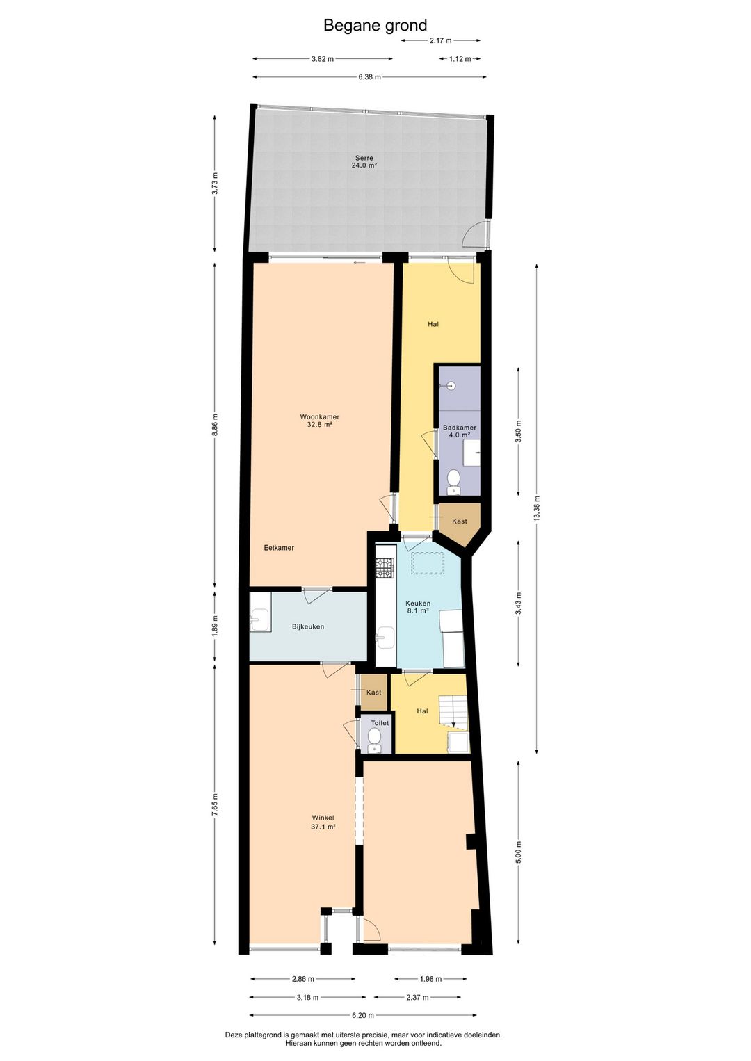 Indeling: entree in winkelruimte (± 37 m²) met toiletruimte en kast, bijkeuken (± 6 m²) tussenruimte met keukenblok, woonkamer ± 33 m² met eetgedeelte, tuingerichte serre 24 m², dichte keuken ± 8 m² met keukenopstelling v.v. inbouw apparatuur en kelder, badkamer met douche, wastafel en toilet, achterhal met kast trapopgang en witgoedopstelling.