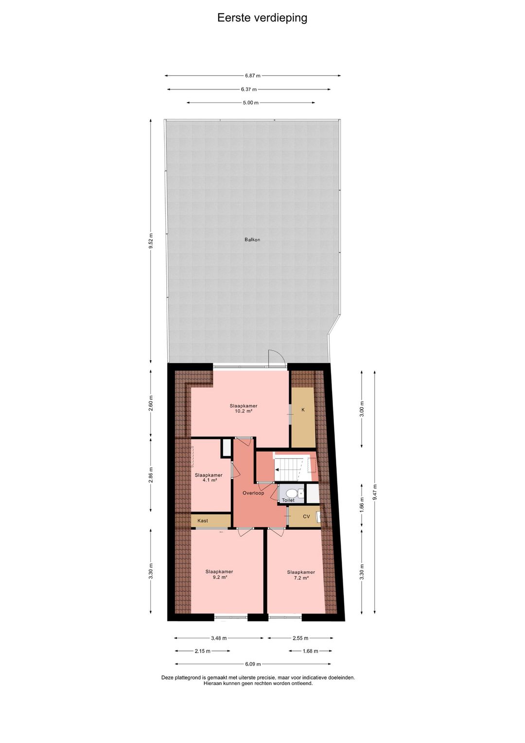 Verdieping: overloop met inloopkast met CV-opstelling en toilet, 4 slaapkamers (± 4, 7, 9 en 10 m²).
