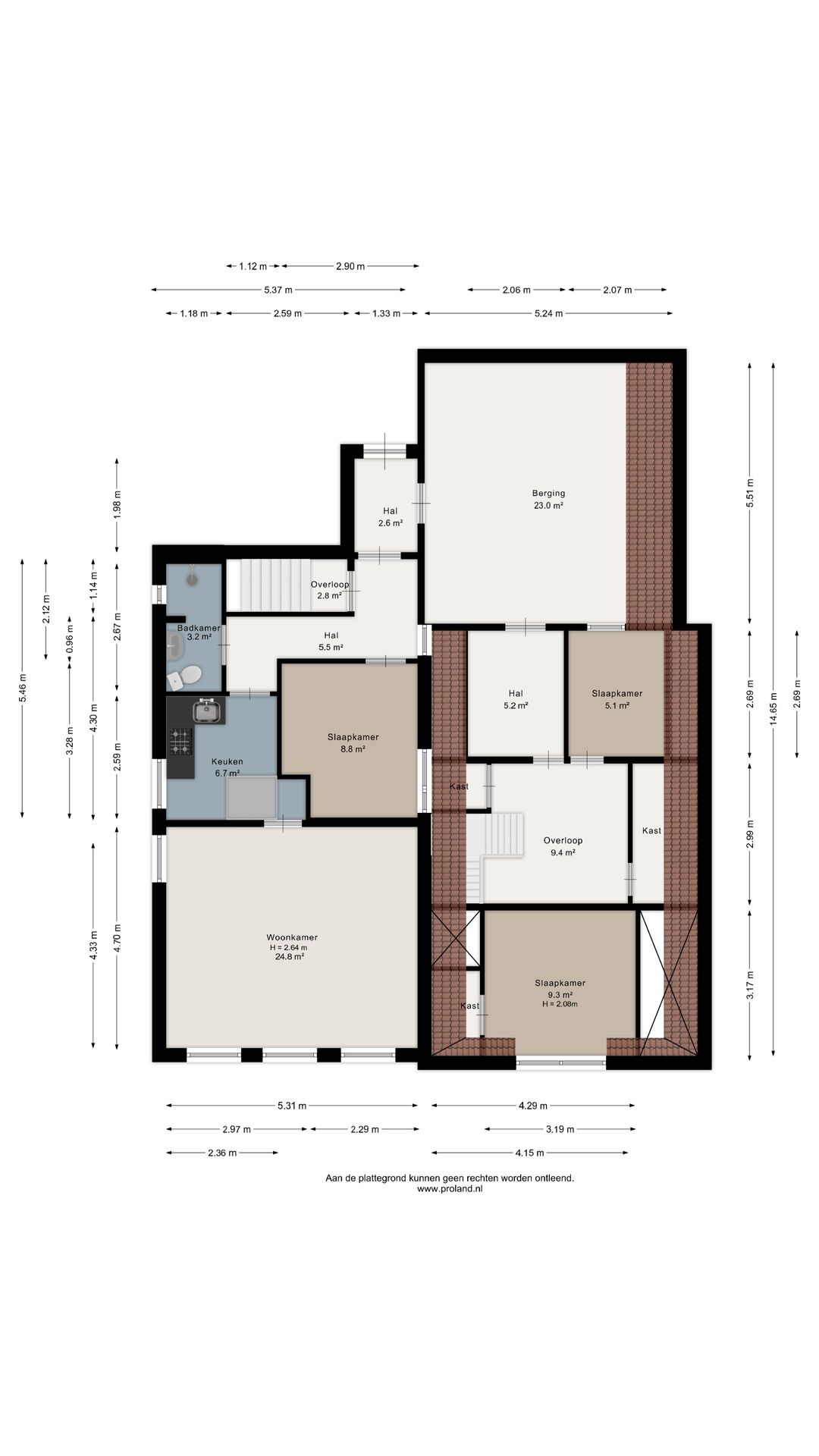 Overloop met toegang tot woonkamer (circa 24,8 m²) aan de voorzijde. Keuken (circa 6,7 m²) en badkamer (circa 3,2 m²). Drie slaapkamers (circa 8,8 m², 9,3 m² en 5,1 m²). Daarnaast een ruime berging van circa 23 m² aan de achterzijde.