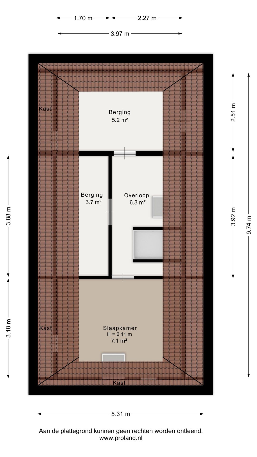 Overloop (circa 6,3 m²). Berging (circa 5,2 m² en 3,7 m²). Slaapkamer (circa 7,1 m², met beperkte stahoogte onder kap).
