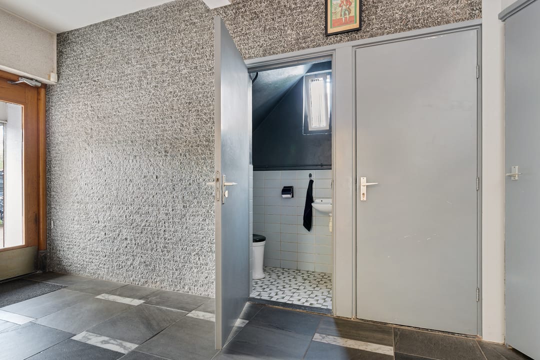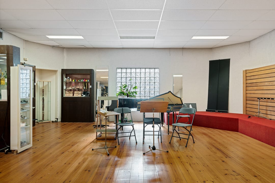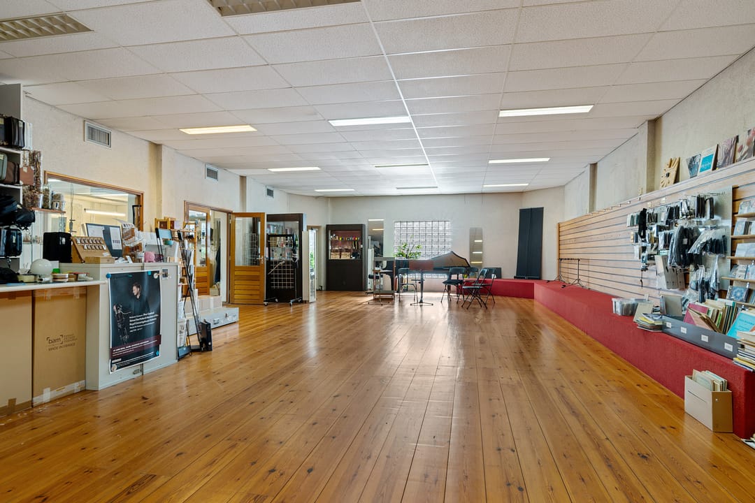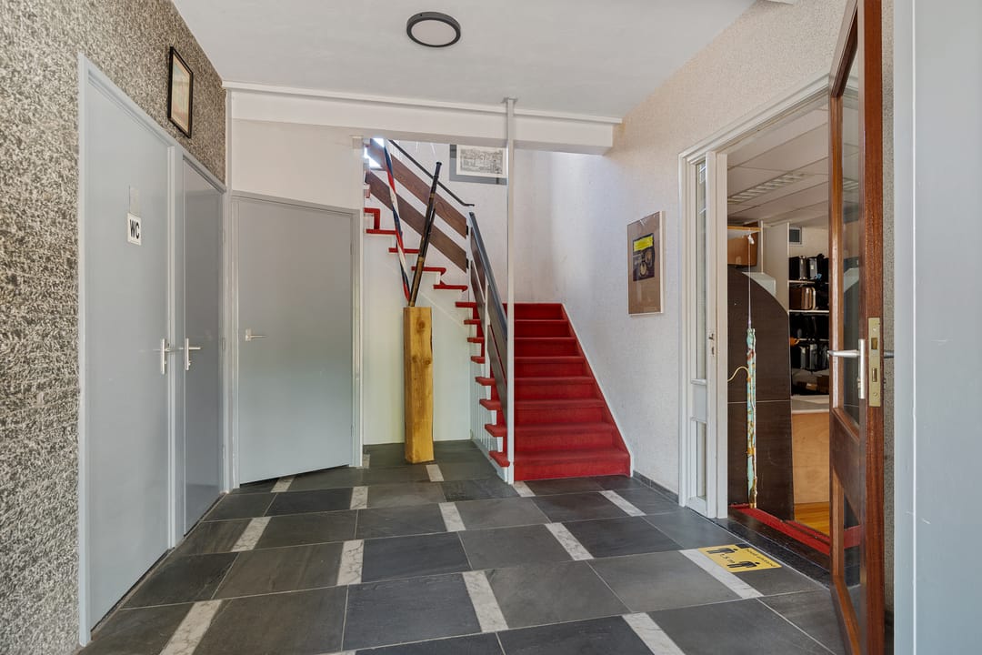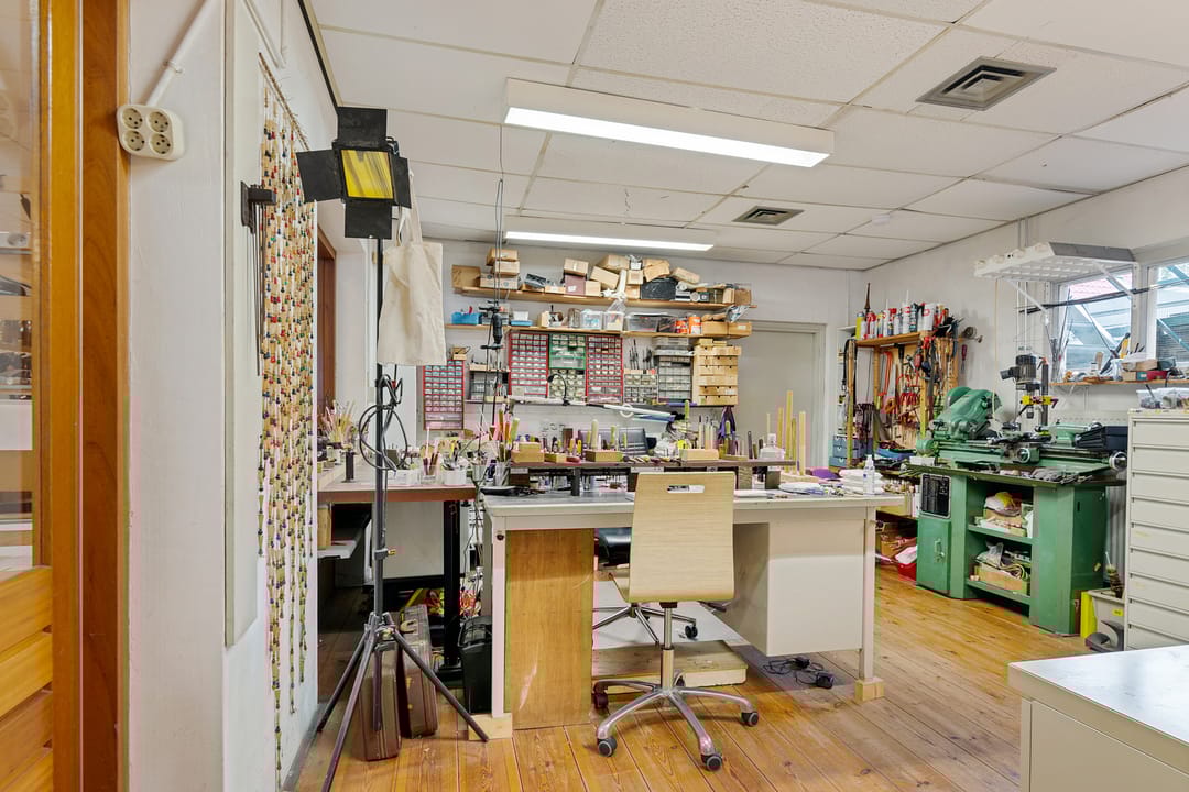 Een ruime entree verzorgt de toegang tot het object. Hier bevindt zich onder andere het trappenhuis naar de etage en de toiletruimte. Naast de verkoopruimte zijn er een drietal ruimtes welke in gebruik zijn als reparatieafdeling, kantoor en keuken.