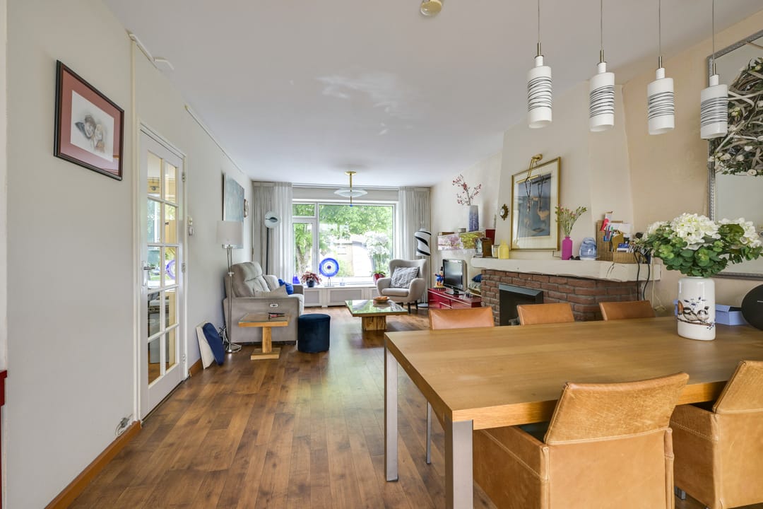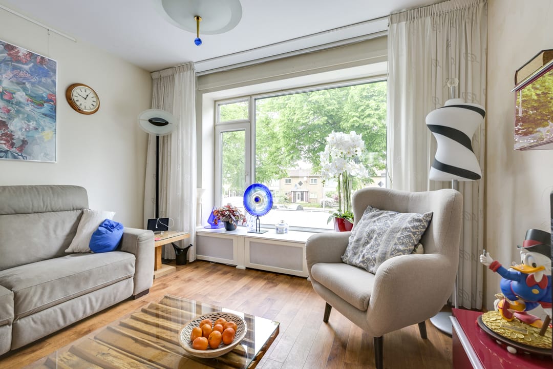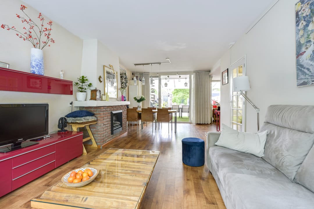 - Gezellige woonkamer met zicht op het groen en dubbele deuren naar het dakterras