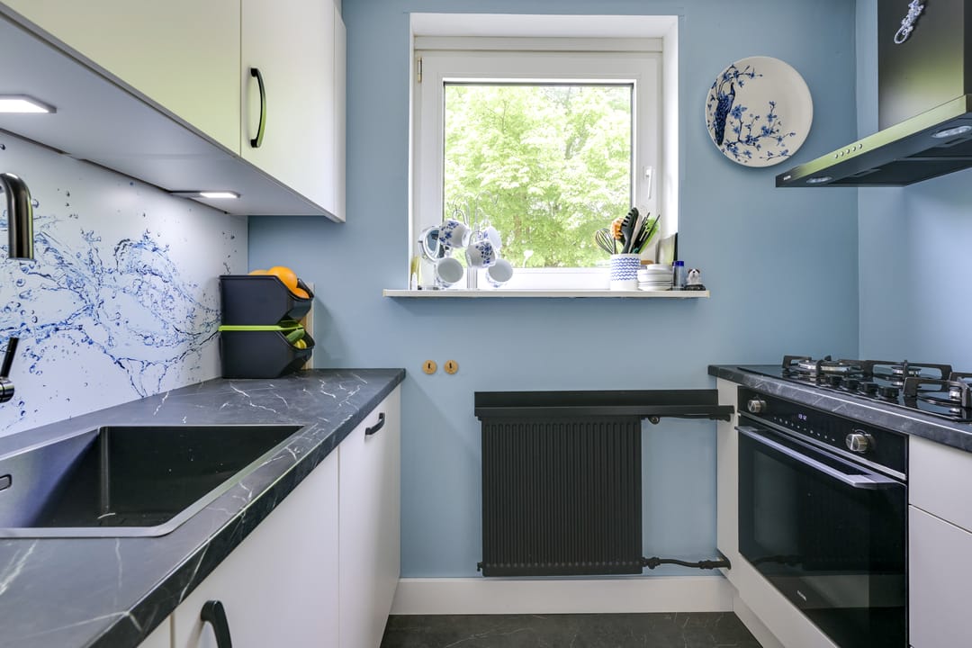 De eerste verdieping is ingericht als een gezellige, lichte woonkamer met een warme houtlook vloer, grote raampartijen en een elektrische haard. De ruimte ademt een prettige, huiselijke sfeer en biedt volop plek voor een comfortabele zithoek én eettafel. De modern maar compacte keuken is ca. 1 jaar oud en heeft alle nodige apparatuur.