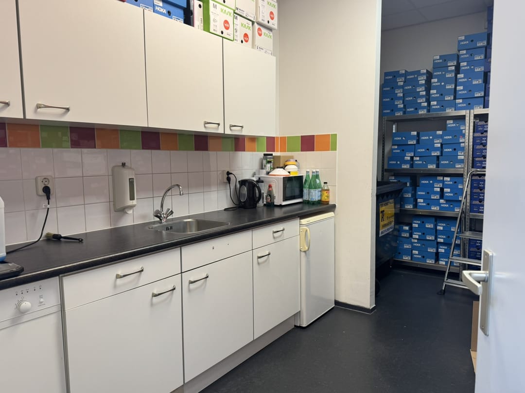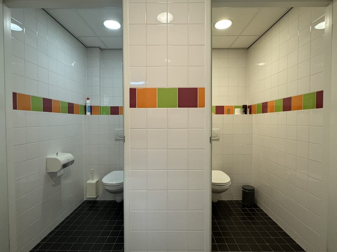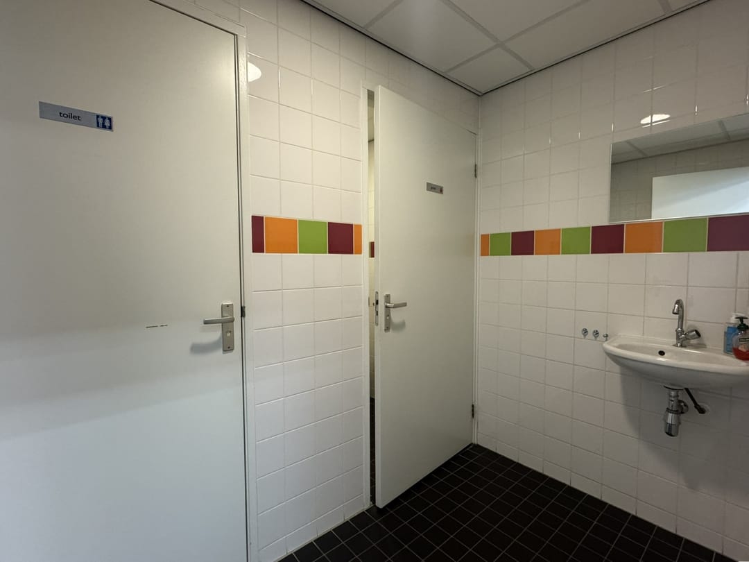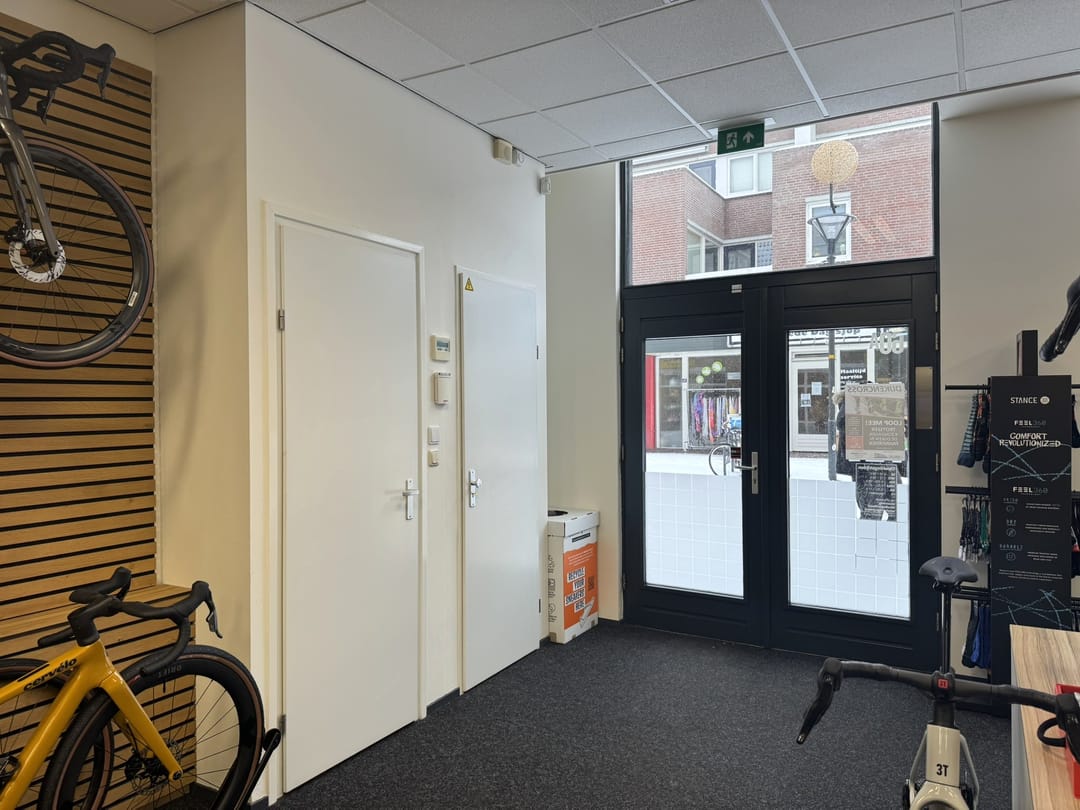 Grotendeels open en eventueel vrij nog indeelbare winkel-/kantoorruimte met aansluitend afgescheiden (spreek)kamer, keuken/kantine, ruime toiletgroep met portaal, wastafel en 2 toiletten.