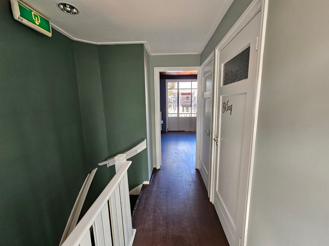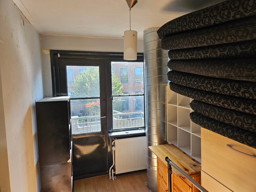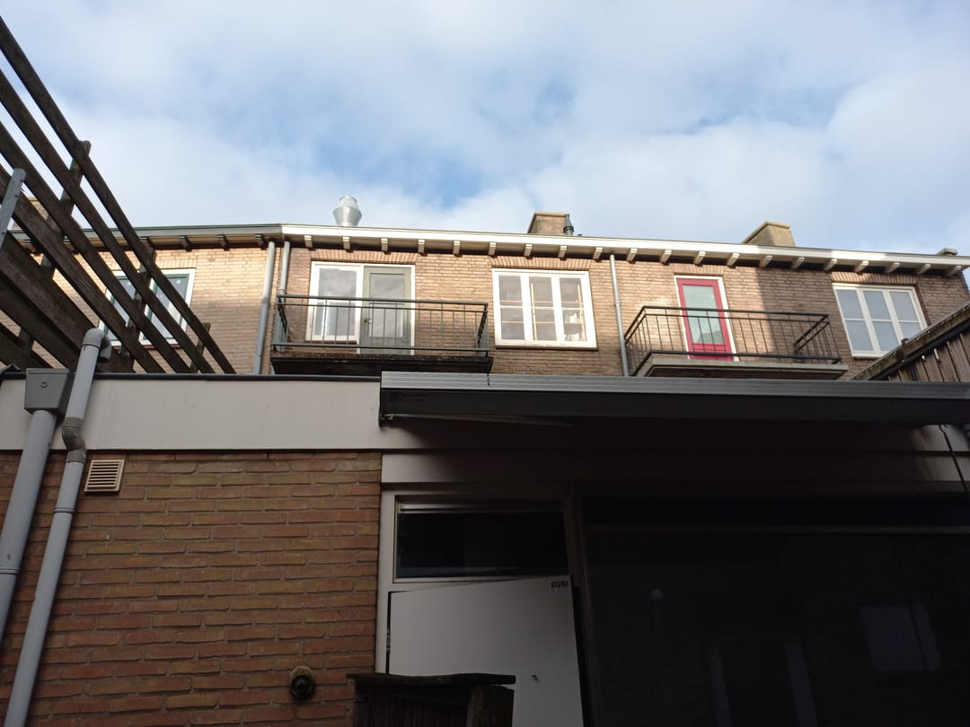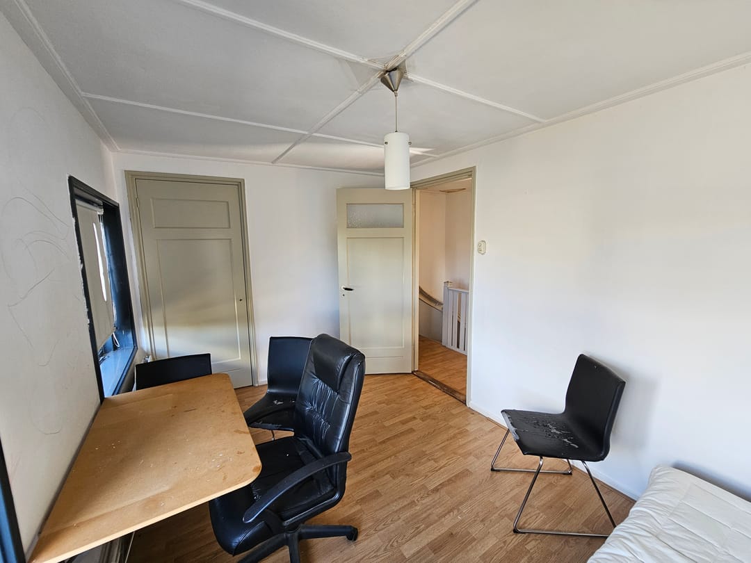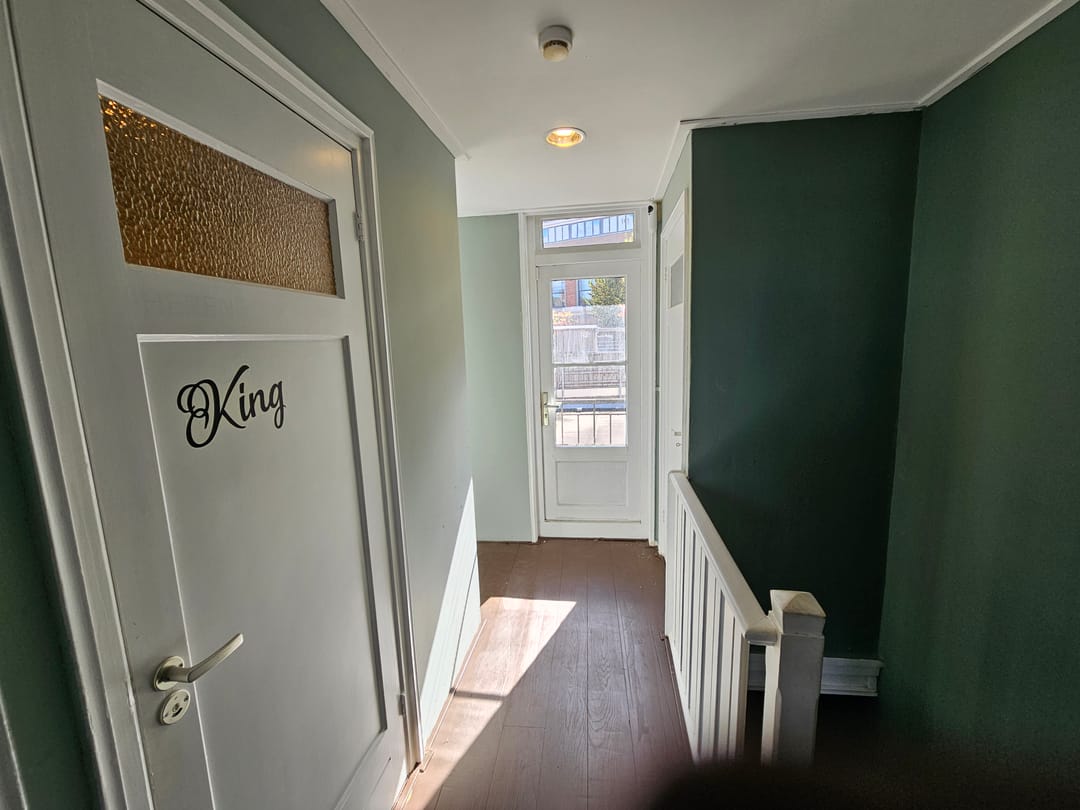 Via de trap betreed je de overloop waar zich 2 toiletten bevinden. Aan de voorzijde van het pand bevindt zich de woonkamer met openslaande deuren en frans balkon. Aan de achterzijde bevindt zich het platte dak dat buren veelal in gebruik hebben genomen als dakterras.