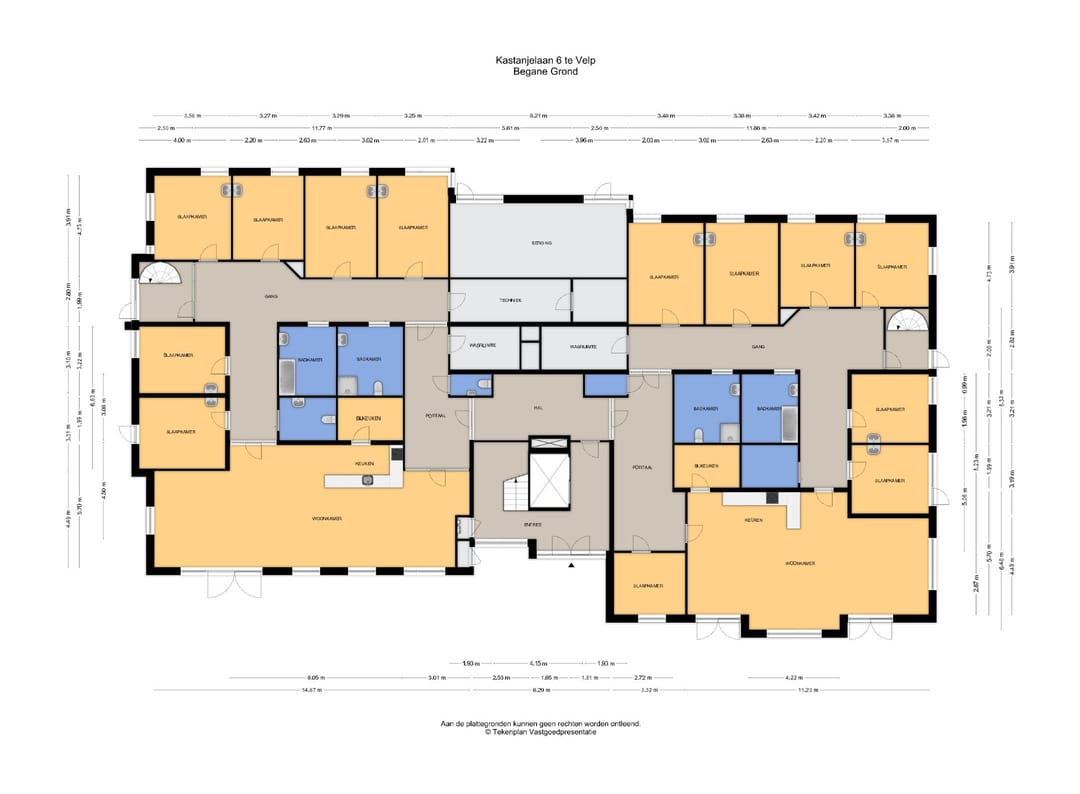 Begane grond: ruime entree, lift, 13 slaapkamers, 2 woonkamers voorzien van open keuken/bijkeuken, 4 badkamers, invalidetoilet, toiletten, 2 wasruimten, berging en overige ruimten.