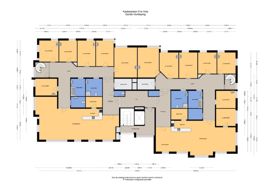 Eerste verdieping: 13 slaapkamers, 2 woonkamers voorzien van open keuken/bijkeuken, 4 badkamers, invalidetoilet, toiletten en 2 wasruimten.