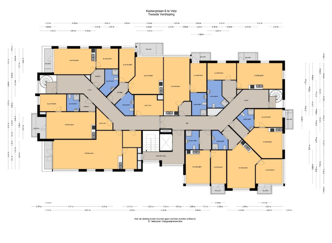 Tweede verdieping: 8 zelfstandige 2 kamerappartementen met een eigen balkon, badkamer en woonkamer met open keuken. Gezamenlijke woonkamer en 2 kantoren.